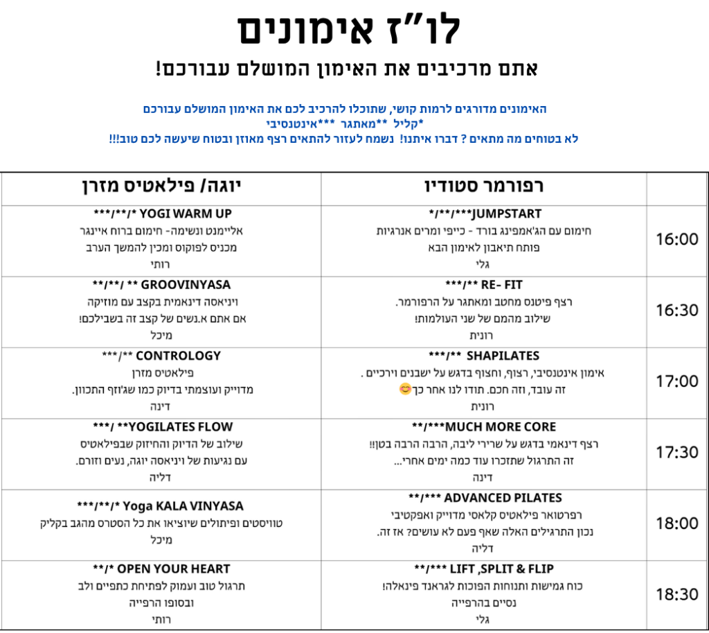 שוב נפגשים לאירוע הכי שווה של השנה, שלוש שעות של טוב לגוף וכיף לנפש עם הצוות המושלם שלנו במערכי שיעור מיוחדים לאירוע:)